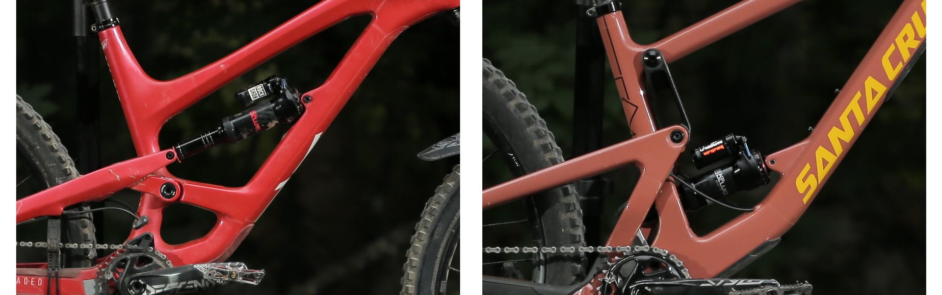 In mountain biking, rear suspension design isn’t just about shocks specifically, but involves the design of the frame and how the shock is integrated with it.Over the years, the development of suspension forks and frames has grown significantly for the better, setting new standards for comfort and efficiency. By understanding frame suspension designs and what they do, we can examine how they affect the performance of our bikes on the trail. It is a very complex topic, but in essence, when we talk about suspension performance we are discussing the interplay of a few key traits - basically, how the combination of frame and shock allows a rider to move forward while keeping the rear wheel tracking over uneven terrain, whilst minimizing harshness to the rider and maximizing control and responsiveness.Though every suspension configuration (meaning combination of frame, shock, valving and setup) out there is fundamentally trying to achieve the same basic goals, the characteristics, ride quality and “feel” of the bike can vary significantly depending on what the designers prioritize.Pedalling efficiency, spring rate curve and impact absorption are three of the most important characteristics of suspension design - they’re not the only important considerations by any stretch, but they are arguably the most critical (other than reliability perhaps!). As you can imagine, achieving a good balance of the three can conjure up all sorts of interesting concepts and designs from manufacturers and individuals alike. These days, however, there are a relatively small number of designs that make up the vast majority of the market. There’s plenty of marketing claims out there about every frame, but as always, the devil is in the details - you can achieve a huge variety of characteristics with almost any patented/marketed frame linkage design. The fact that two frames look very similar in their layout says nearly nothing about how they behave - small alterations can create huge differences in the ride.While we won’t get too nerdy and in-depth about suspension kinematics (anti-squat, brake jack, pedal-kickback, anti-rise, etc) because most of these don’t strongly relate to the shock absorber itself, there is one topic we’d like to cover: leverage rates.