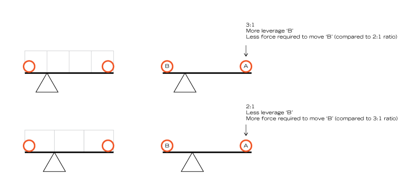 Since everyone in the bike industry seems to use leverage rate rather than motion rate, we’ll discuss it in those terms. A progressive leverage rate curve (or a progressive segment of a leverage rate curve) is where the curve trends down on a graph (like the Transition Spire in the graph above). This means that the amount of force required to move the rear wheel a given increment is increasing because as the suspension compresses further, the leverage that the axle has over the shock is decreasing. An alternative way to consider it is that the mechanical advantage that the shock has over the axle is increasing.While this can seem confusing as the number seems to be decreasing from 3 to 2.35, hopefully this diagram can explain it: