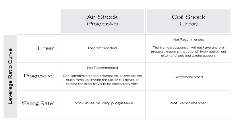 It is also important to consider a frame's leverage curve when determining if an air shock or coil shock would be best suited.