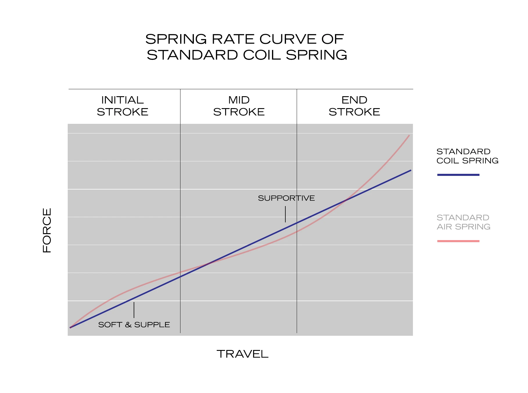 Midstroke - where traditional air spring rates drop off in the midstroke, our proprietary Midstroke Support Valve technology boosts the midstroke spring rate to maintain linearity, for support, predictability, ride height and compliance